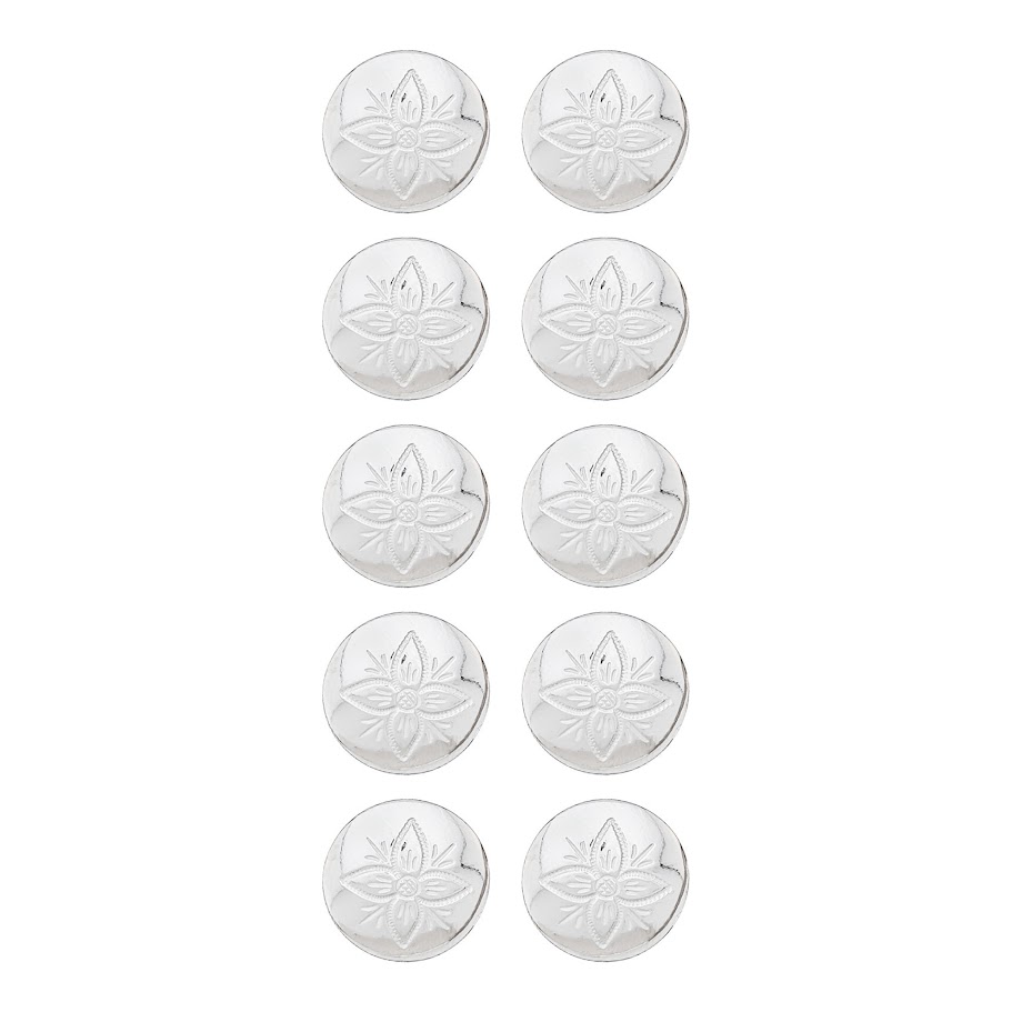 10-pk med knapper i hvitt sølv. Knappene har gravert mønster. De har lang hempe, og måler 17mm.