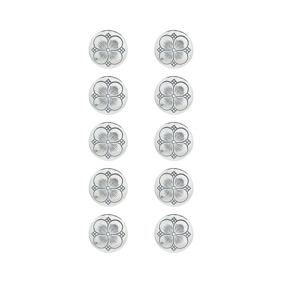 10-pk med knapper i oksidert sølv. Knappene har kløvermønster. De har kort hempe, og måler 16mm.