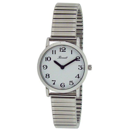 Bonett dameur i stål med hvit skive. Klokken har store, tydelige tall. Leverandørens varenummer: 2089DSL.