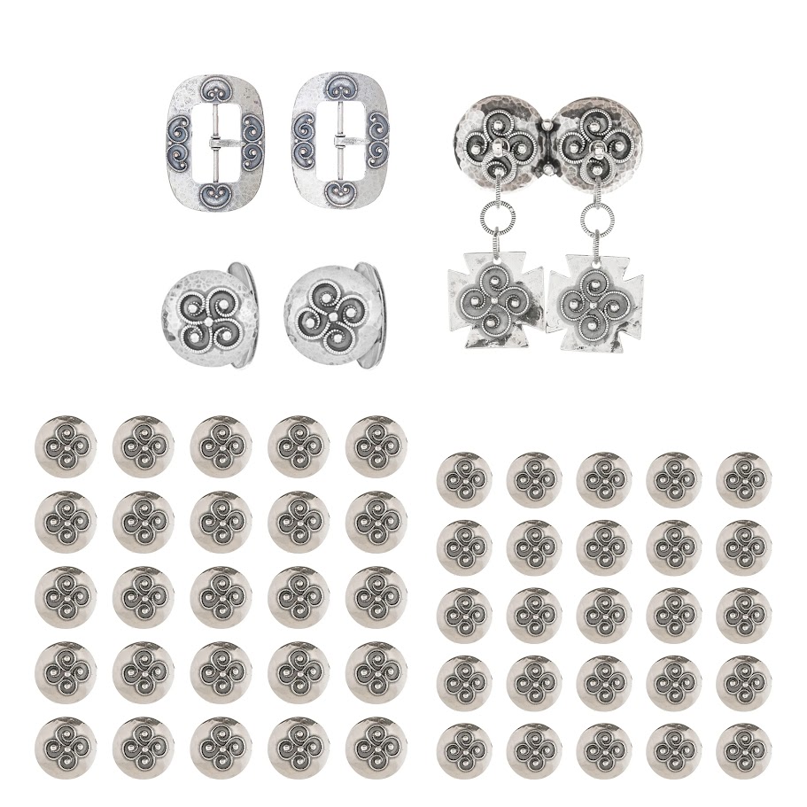 Komplett sett med bunadsølv til Rogaland herrebunad. Sølvet er i oksidert sølv, med filigran.
