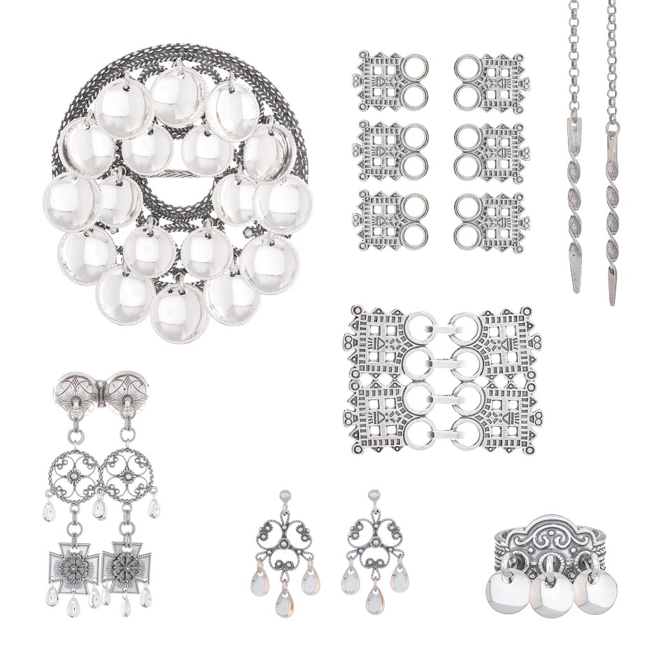 Komplett sett med bunadsølv til Sunnfjordbunad, i oksidert sølv.