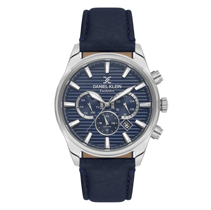 Daniel Klein Exclusive herreur i stål med blå skive & blå skinn reim 5 ATM 44mm