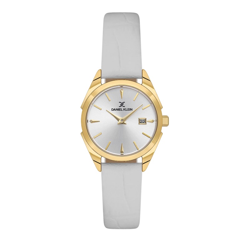 Daniel Klein Premium dameur i forgylt stål med sølvfarget skive og hvit skinn reim 3 ATM 28mm