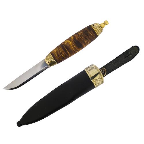 Flott bunadskniv med forgylt sølvbeslag og valbjørk skaft. Gravyren er hentet fra kongemonogrammet til Christian 7.
