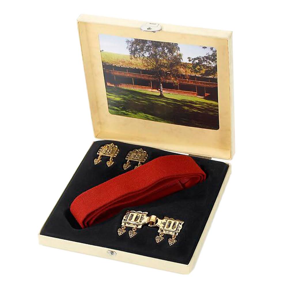 Startpakke bunadsbelte til Romerikebunad. Inneholder rødt stoffbelte, beltelås og 2stk støler i forgylt sølv.