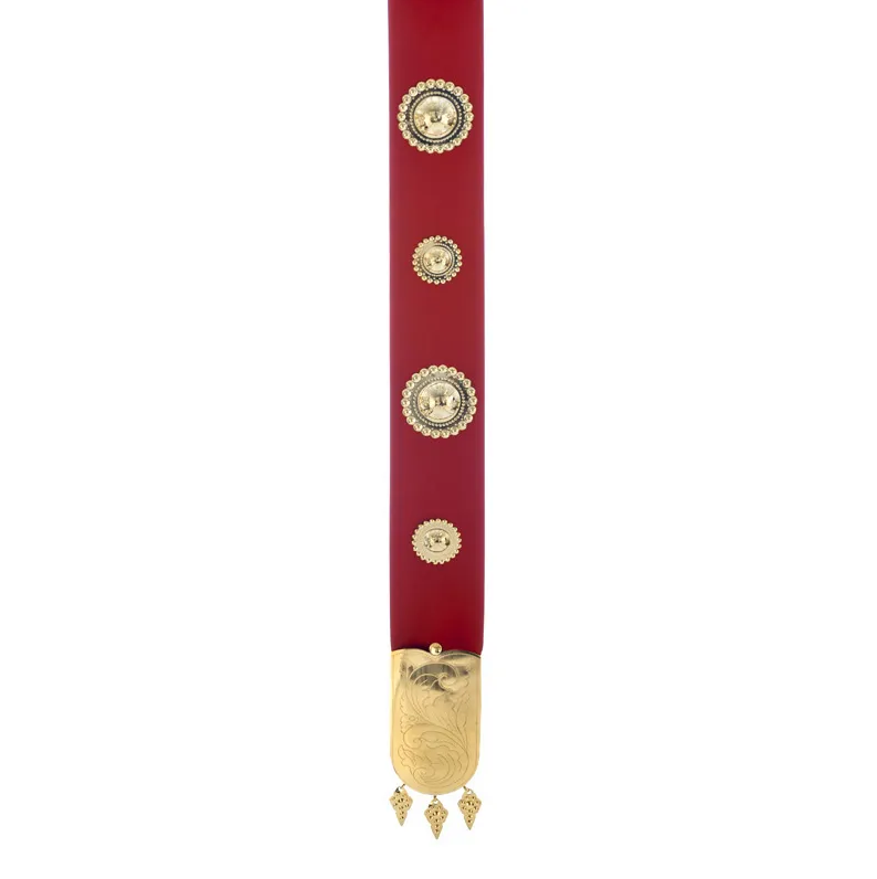 Komplett fangband, med rød skinnlist. Søljene i er i forgylt sølv.