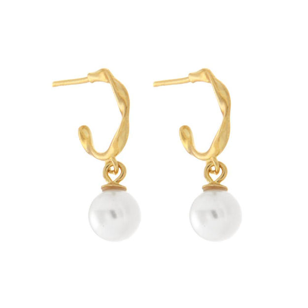 Nydelige øreringer i forgylt sølv, med vridd overflate og perleheng. Den hvite perlen måler 6mm.