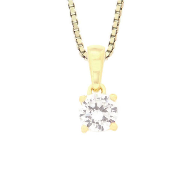 Vakkert halssmykke i forgylt sølv, med blank zircon. Steinen måler 5mm, og er fattet med fire klør. Lengde: 42cm.