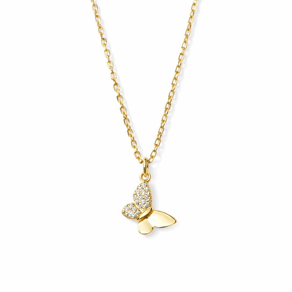 Forgylt sølv halssmykke sommerfugl med zirconer 47cm