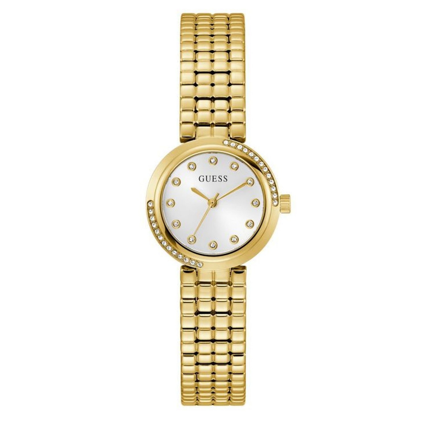 Guess Ladies Bejeweled gullfarget stål 28mm 30 ATM hvit skive