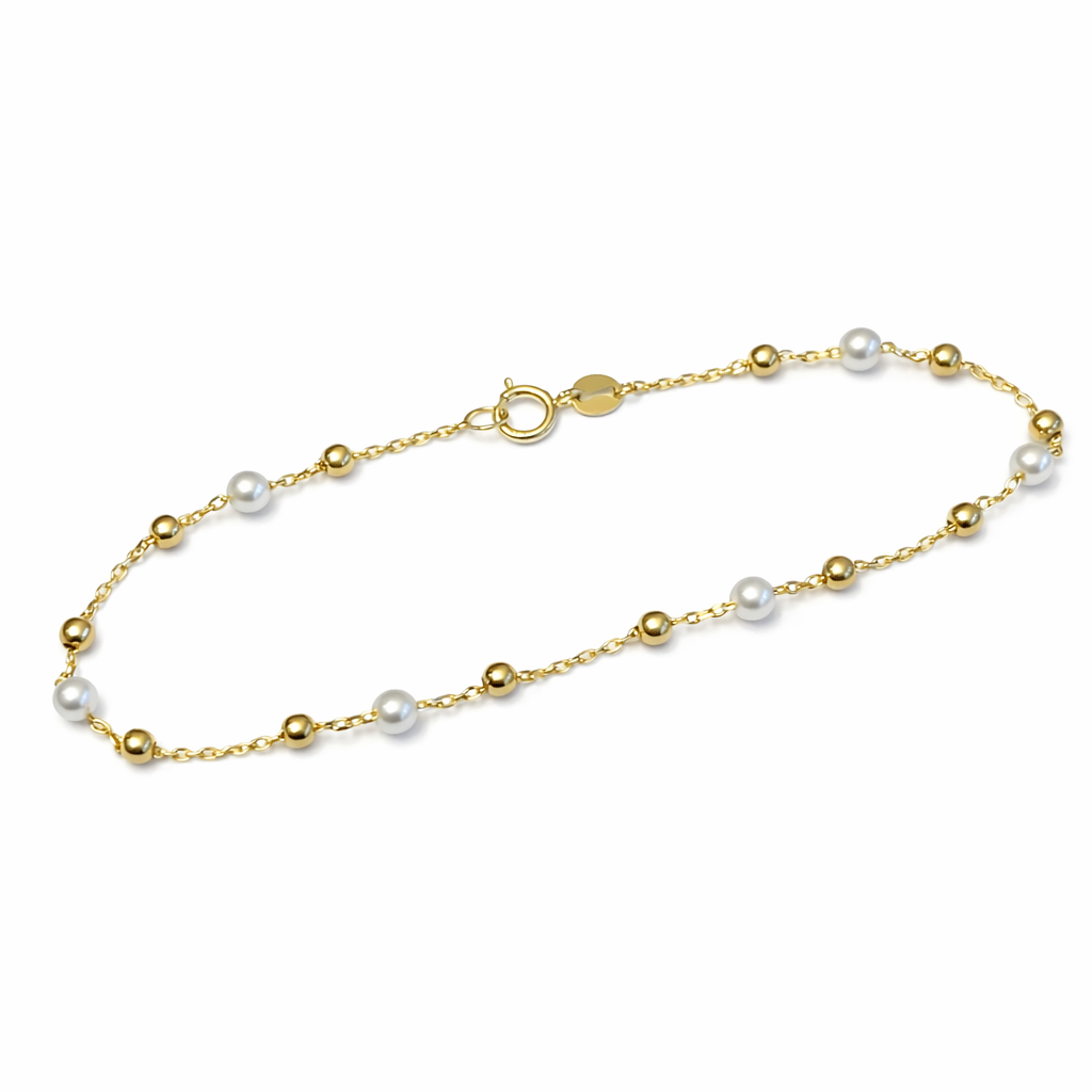 Klassisk armbånd i 14K/585 gull, med kuler og hvite perler.