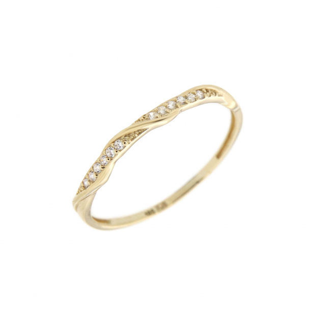 Vakker ring i 14K/585 gull, dekorert med 12 stk blanke Cubic Zirconia. Ringen har ett tvunnet design, som gjør den unik og spennende.