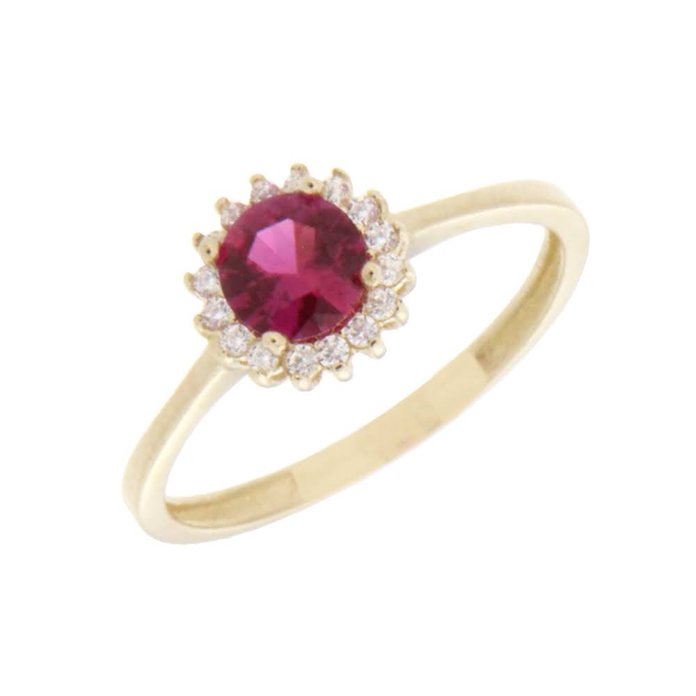 Gull ring rund rosett med rød/blanke Zirconer