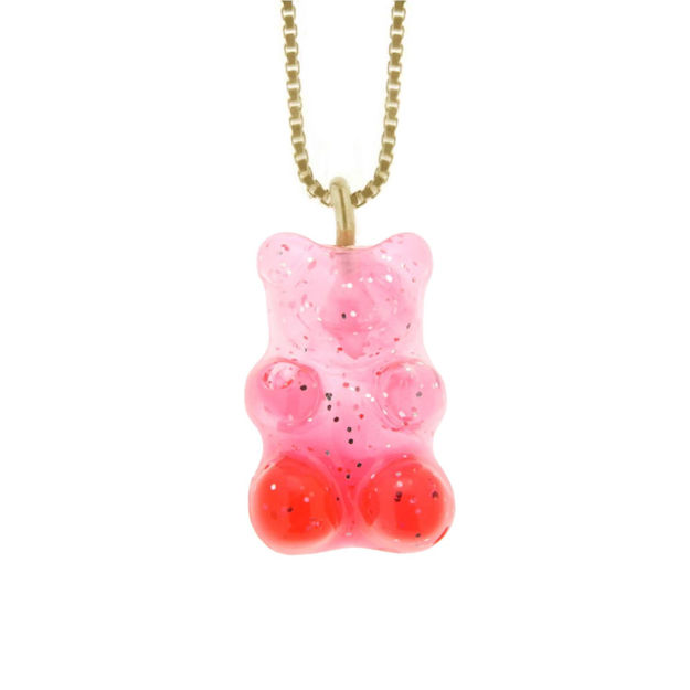 Bli med på trenden! Kule gummibjørn-smykker, med kjede i forgylt sølv. Gummibjørnene er tofarget og med glitter. Fåes i mange fine farger. Leveres med kjede.
