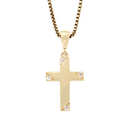 Klassisk kors i 14K/585 gull, med blanke zirconer. Størrelse: 13x17mm. Leveres uten kjede.