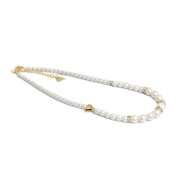Kort kjede hvite perler gullbelagt hjerte og blanke stener