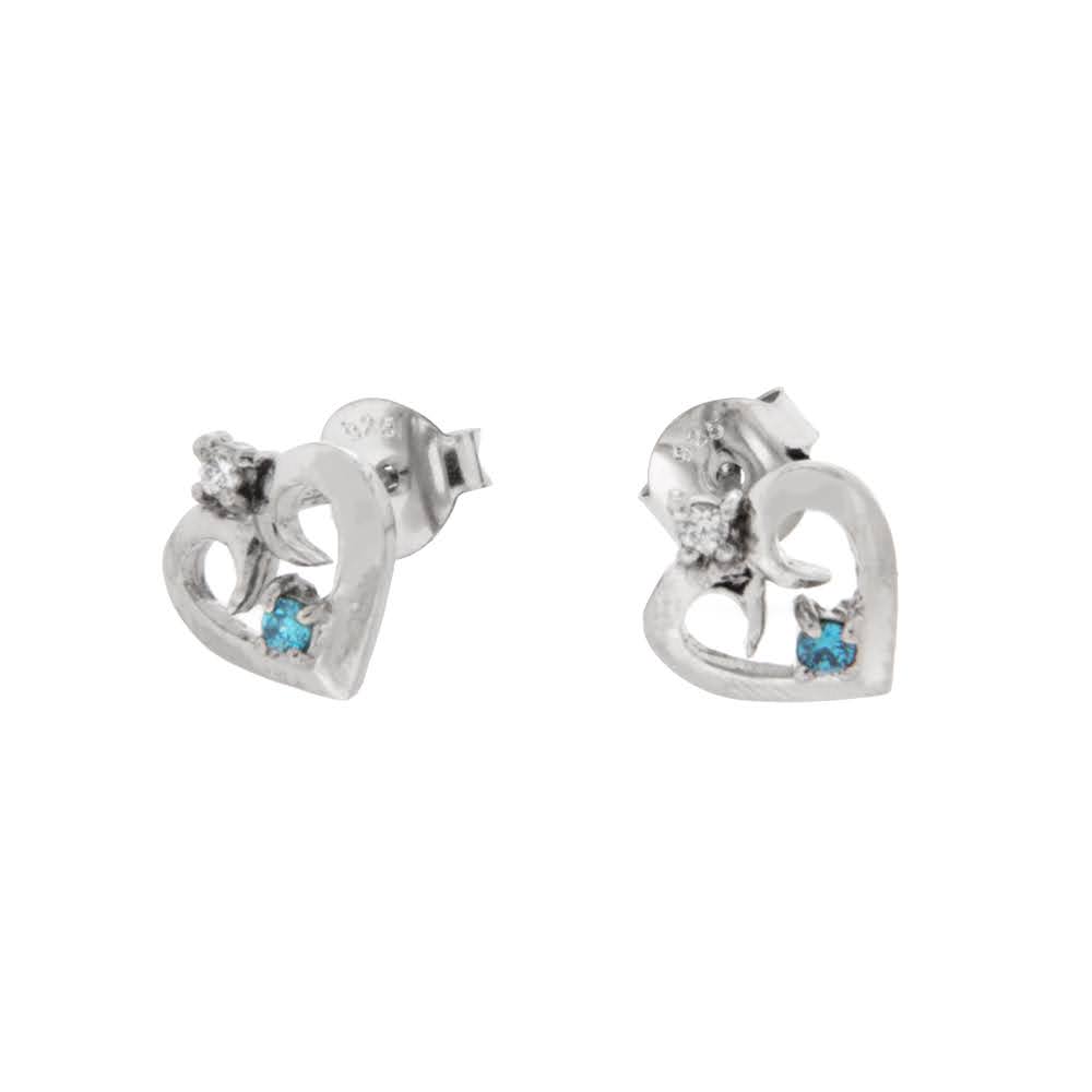 Skjønne øredobber i rhodinert sølv, med hjerte. Nydelig dekorert med aquablå og blanke cubic zirconia. Størrelse: 10mm.