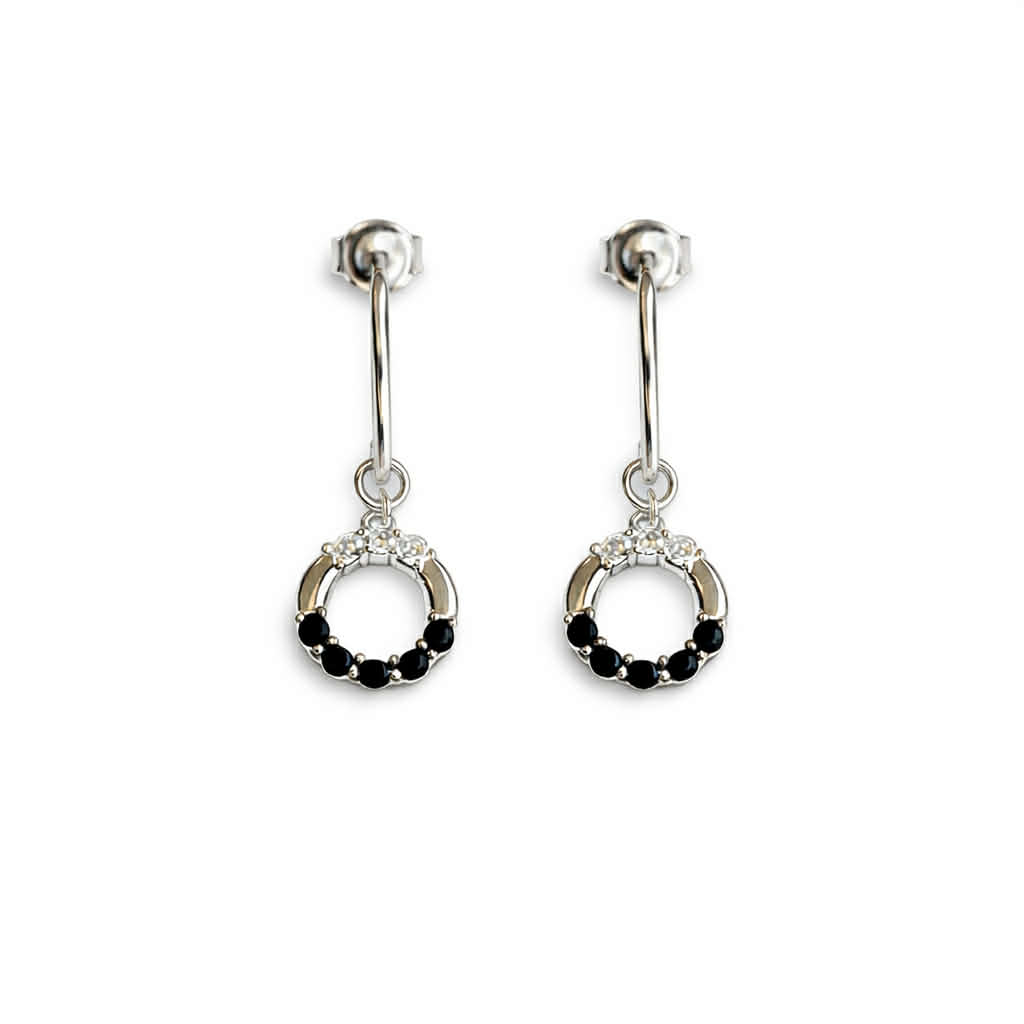 Rhodinert sølv øreheng åpen sirkel med sorte/blanke cubic zirconia