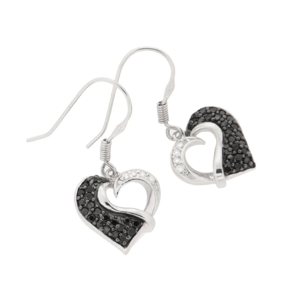 Rhodinert sølv øreheng hjerte med blanke og sorte zirconer
