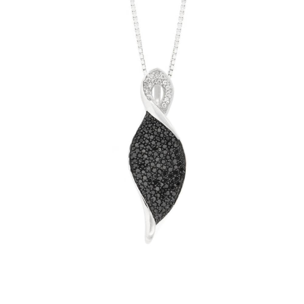 Rhodinert sølv anheng blad med sorte og blanke zirconer 45cm