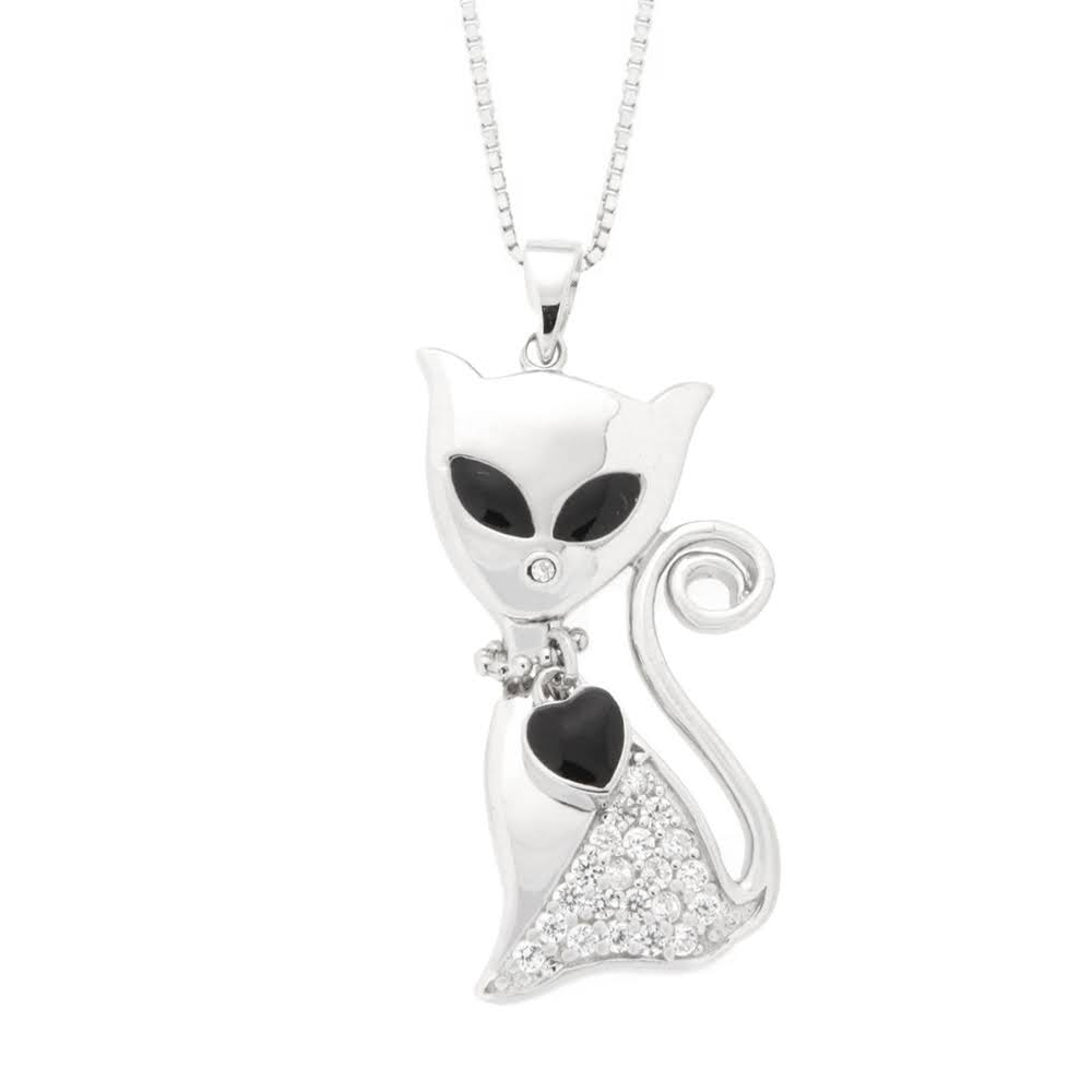 Rhodinert sølv anheng katt med blanke zirconer og sorte detaljer 20x36.5mm