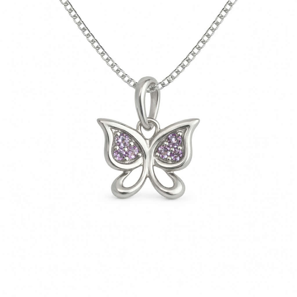 Rhodinert sølv anheng sommerfugl med lilla zirconer 14mm 42cm