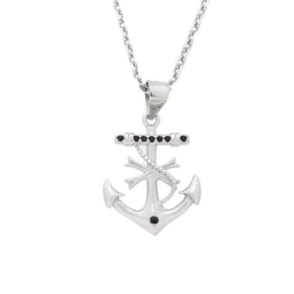 Rhodinert sølv halssmykke anker med svarte zirconer