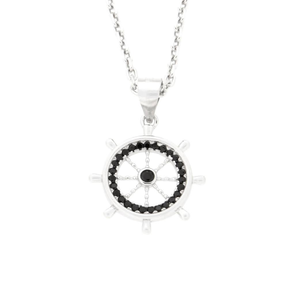 Rhodinert sølv halssmykke skipsratt med svarte zirconer