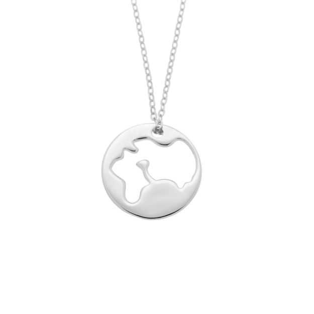 Stilig halssmykke i rhodinert sølv, med verdenskart. Anhenget måler 20mm. Leveres med flatt ankerkjede på 60cm.