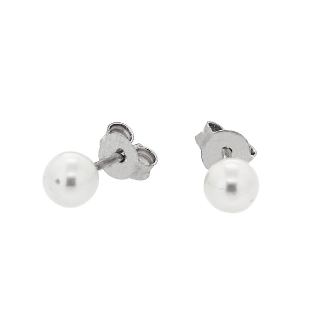 Stilrene øredobber i sølv, med hvit perle. Diameter: 5mm.