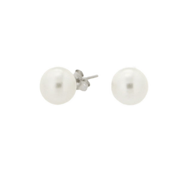 Klassiske, stilrene øredobber i rhodinert sølv, med imitert perle. Diameter: 10mm.