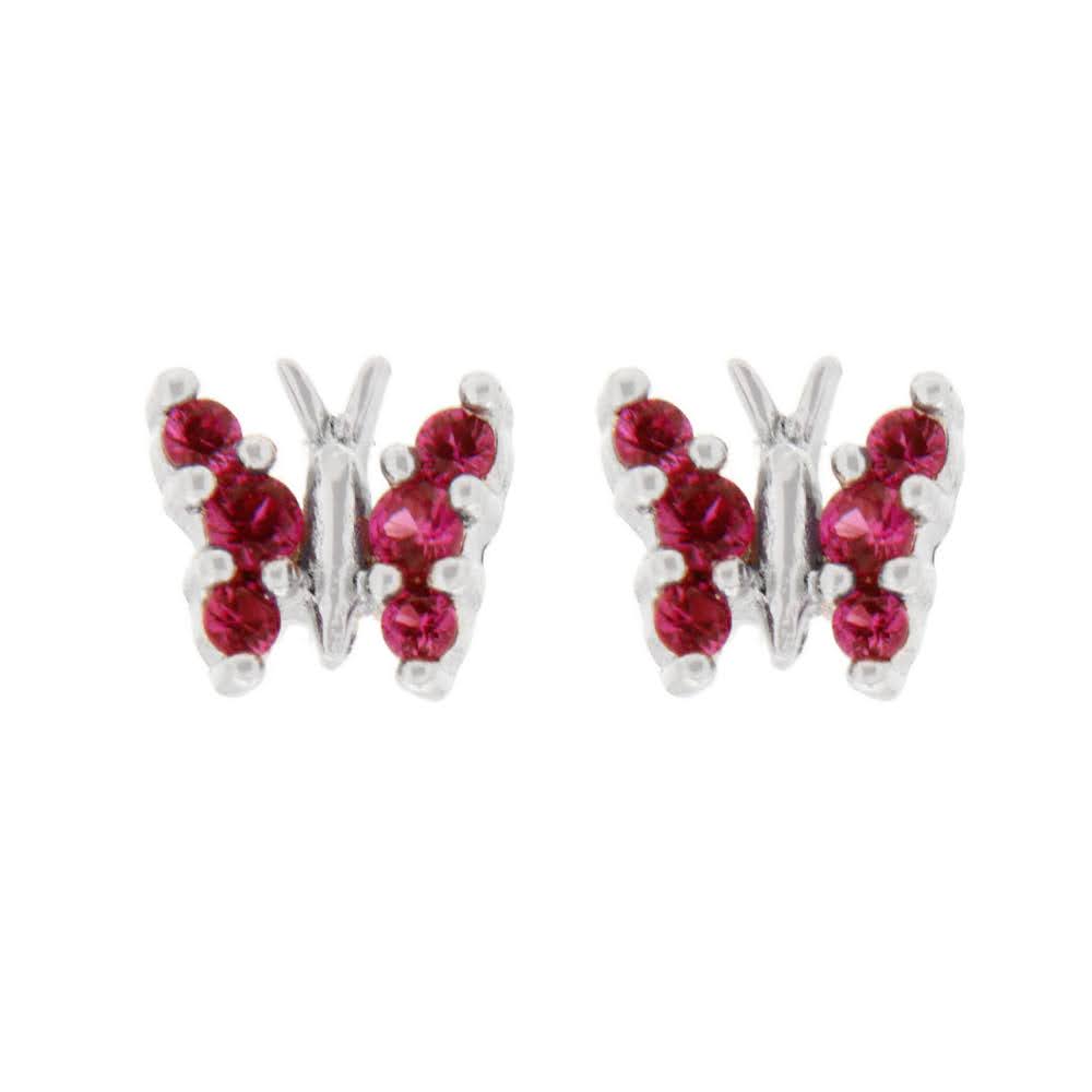 Nydelige øredobber i rhodinert sølv, med sommerfugl og røde Cubic Zirconia.