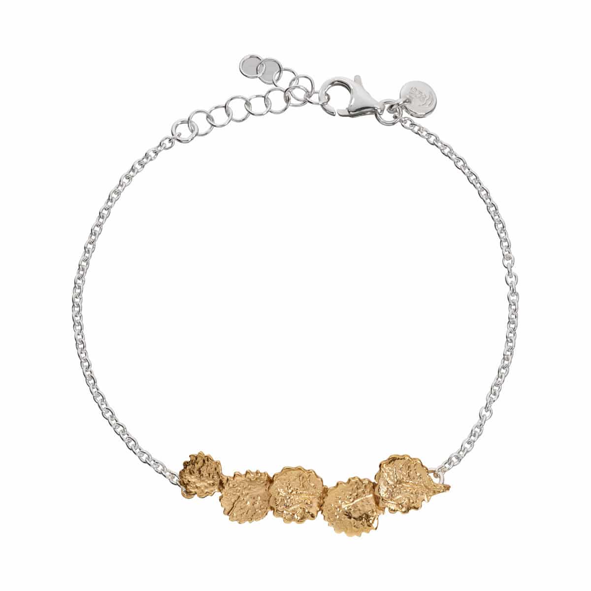 En flott armlenke i forgylt sølv 925. Designet er inspirert av fjellbjørka. Regulerbar rund ankerkjede lengde 16+3cm.