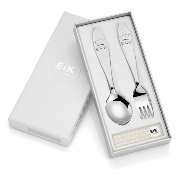 Eventyrlig. Gaveeske med skje og gaffel i den fineste sølv til en liten prins eller prinsesse. Lengde bestikk: 14,5cm.