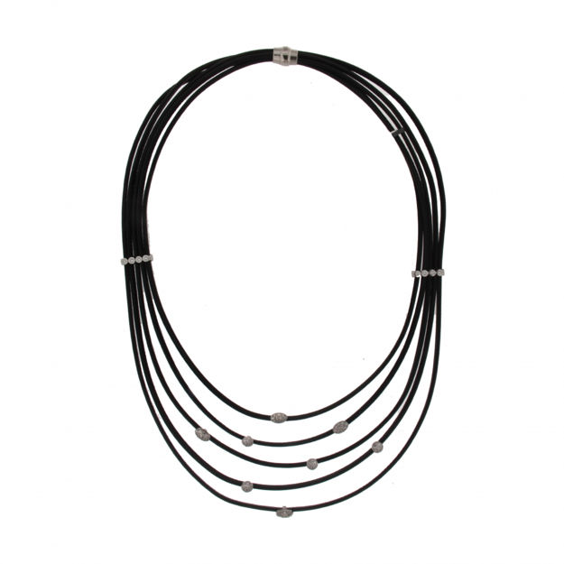 Stilig halssmykke i sølv og sort skinn. Smykket består av fem rader. Lengde: 48cm (Korteste).