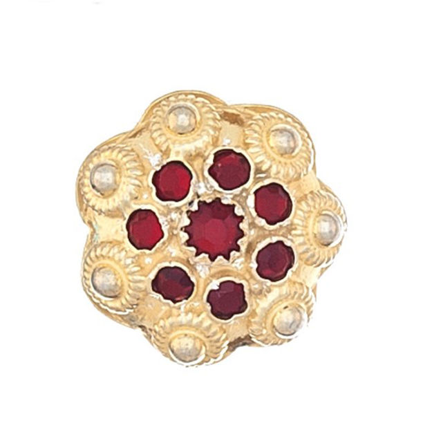 Halsknapp i forgylt sølv, med røde stener. Diameter: 1,9cm