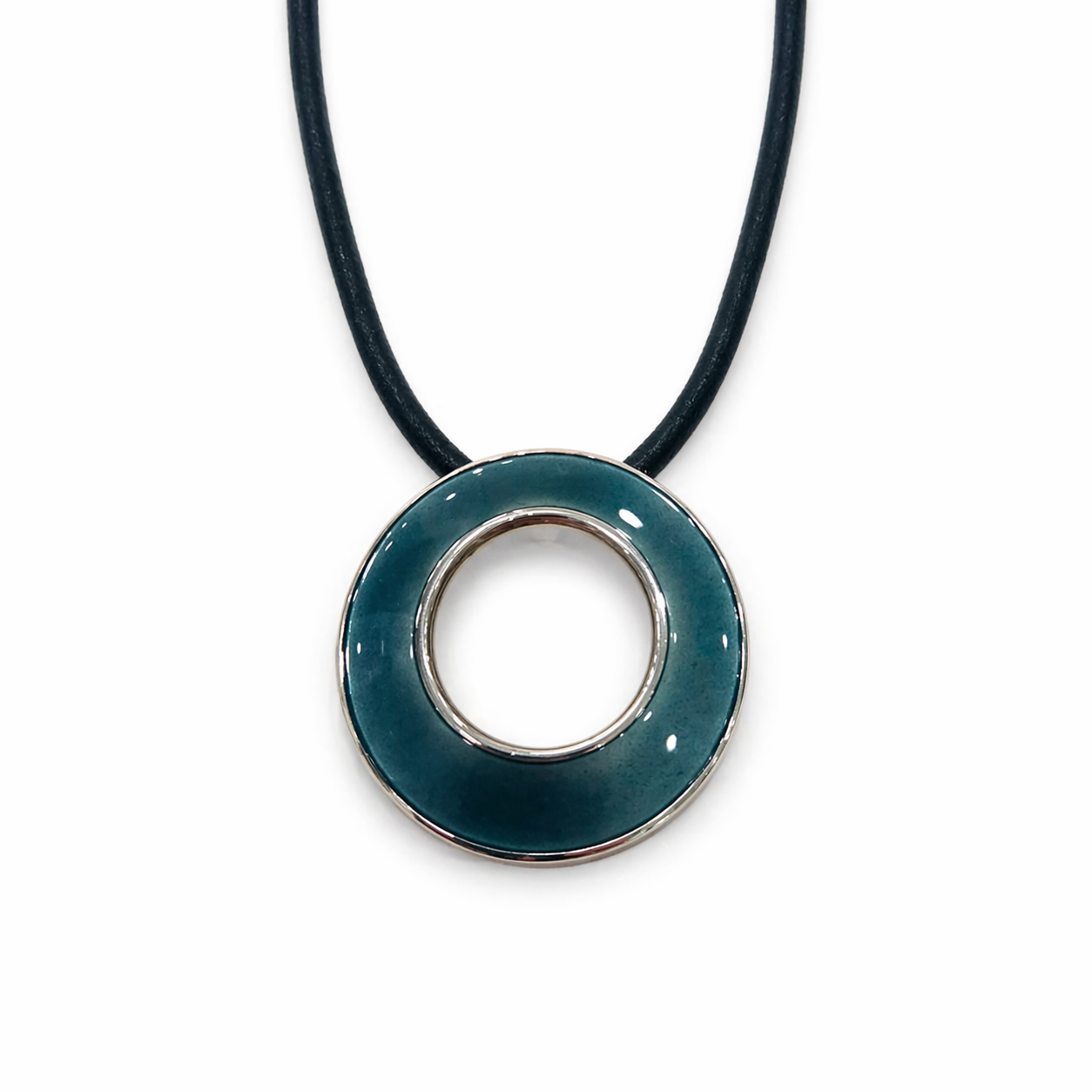 Sølv halssmykke sort reim med grå sirkel