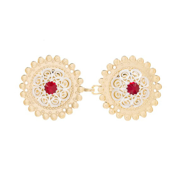 Sølv spenner til bunad, forgylt med røde steiner og syhull