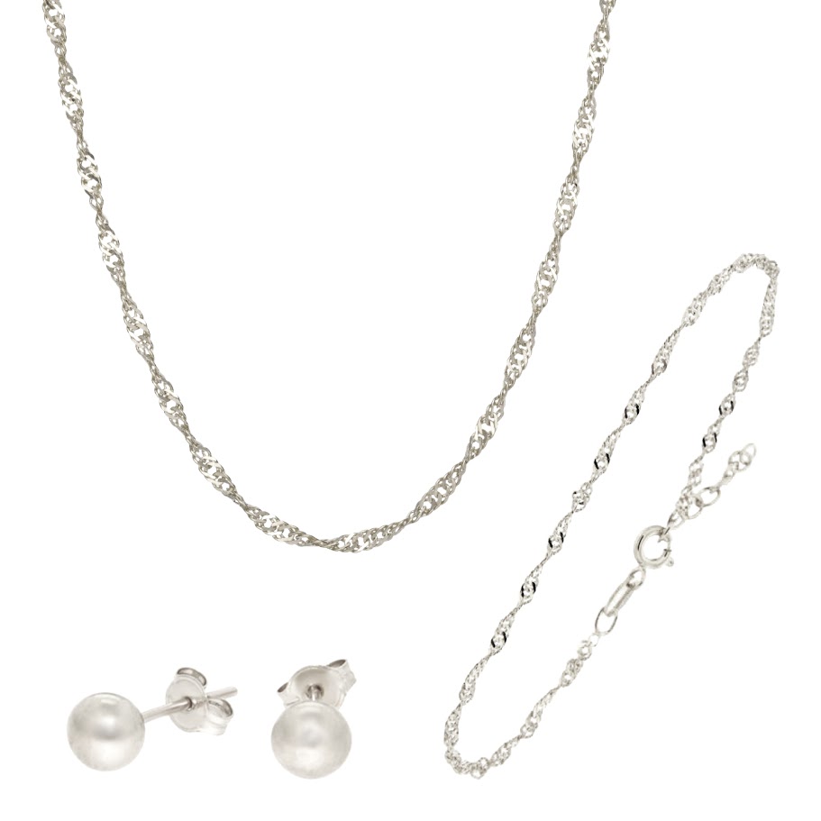 Sett med halskjede, armlenke og kuleøredobber i sølv. Kjedene har Singapore-design.