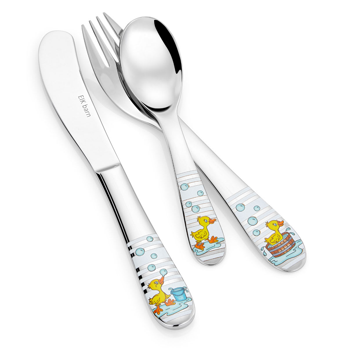 Gakki stålbestikk, 3 deler. Barnebestikk i tre deler. Består av kniv, gaffel og skje. Tåler oppvaskemaskin.
