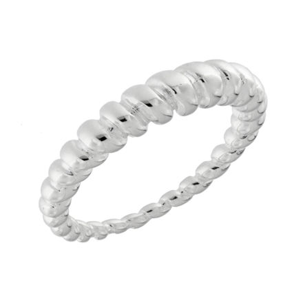 Trendy ring i rhodinert sølv, med vridd design. Bredde: 1,5-4,6mm (Smalere på baksiden).